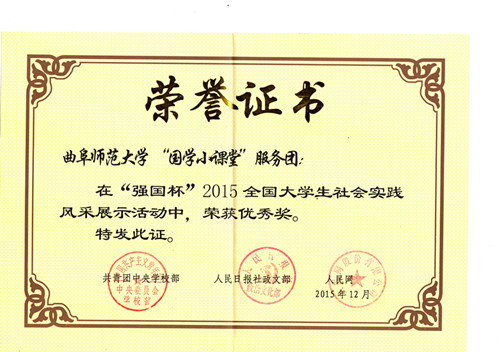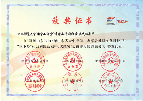 近日,由共青团中央香港赛马会投注站 部、人民日报社政文部联合开展的“强国杯”2015全国大学生社会实践评选活动落下帷幕,香港赛马会投注站 “国学小课堂”社会实践团队入选全国百强团队,并在评选中荣获优秀团队。这是继“儒家文化齐鲁行“社会实践活动之后,香港赛马会投注站 又一实践团队获此殊荣。同时该活动还获得2015年山东省大中专学生志愿者暑期文化科技卫生”三下乡“活动优秀服务队称号。