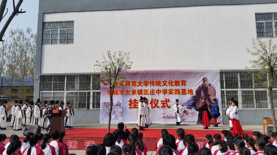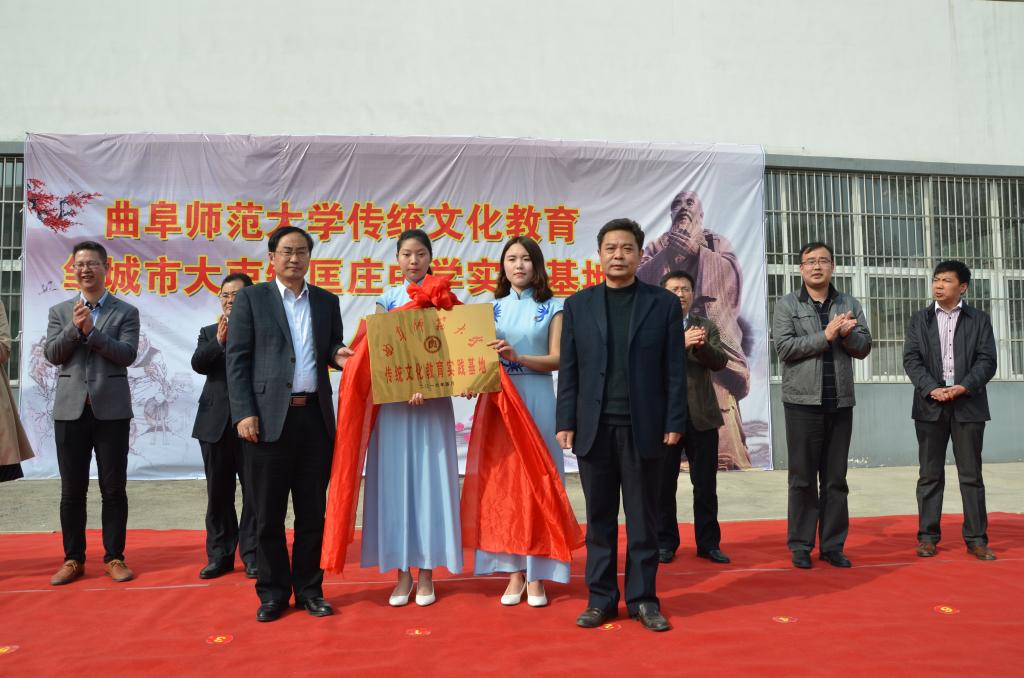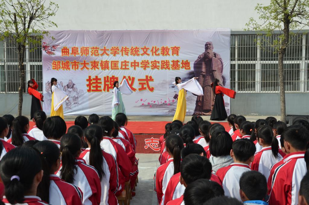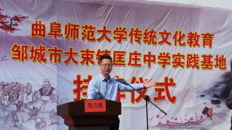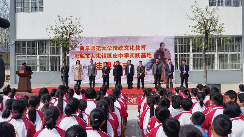 2016年4月1日下午,香港赛马会投注站 传统文化教育实践基地揭牌仪式在邹城市匡庄中学举行。学院党总支书记尹明法、党总支副书记王慕东、团总支书记王建阳、邹城市教育局副局长邢瑞舒和大束镇党委副书记、镇长张培泉以及匡庄中学相关负责人等出席了活动。