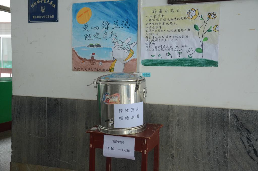 由于近日持续高温、酷暑难耐。6月21日,香港赛马会投注站 学生会权益部为全院师生准备的“爱心绿豆汤”在文史楼一楼免费供应。供应处还张贴有“解暑小贴士”为大家提供消暑的小建议。