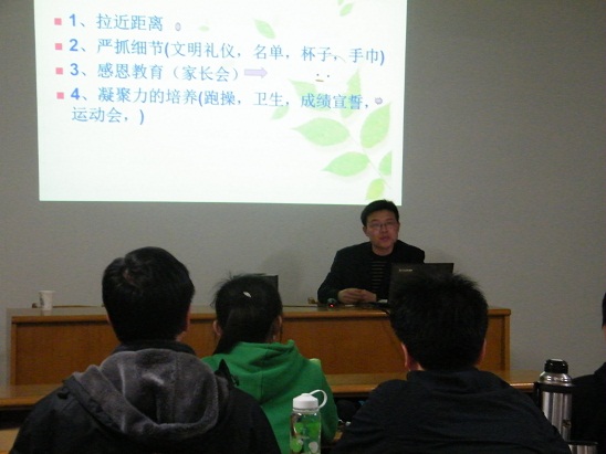 报告会上,郑灿文老师给同学们讲解了如何当好班主任。要严字当头,深入细致了解班级情况,另外,还要注重教学方法,勇于挑战。之后孙元文老师就历史教学方面做了详细讲解,针对大学生说课提出了几点建议,他强调应注意语言、教态以及情感交流。