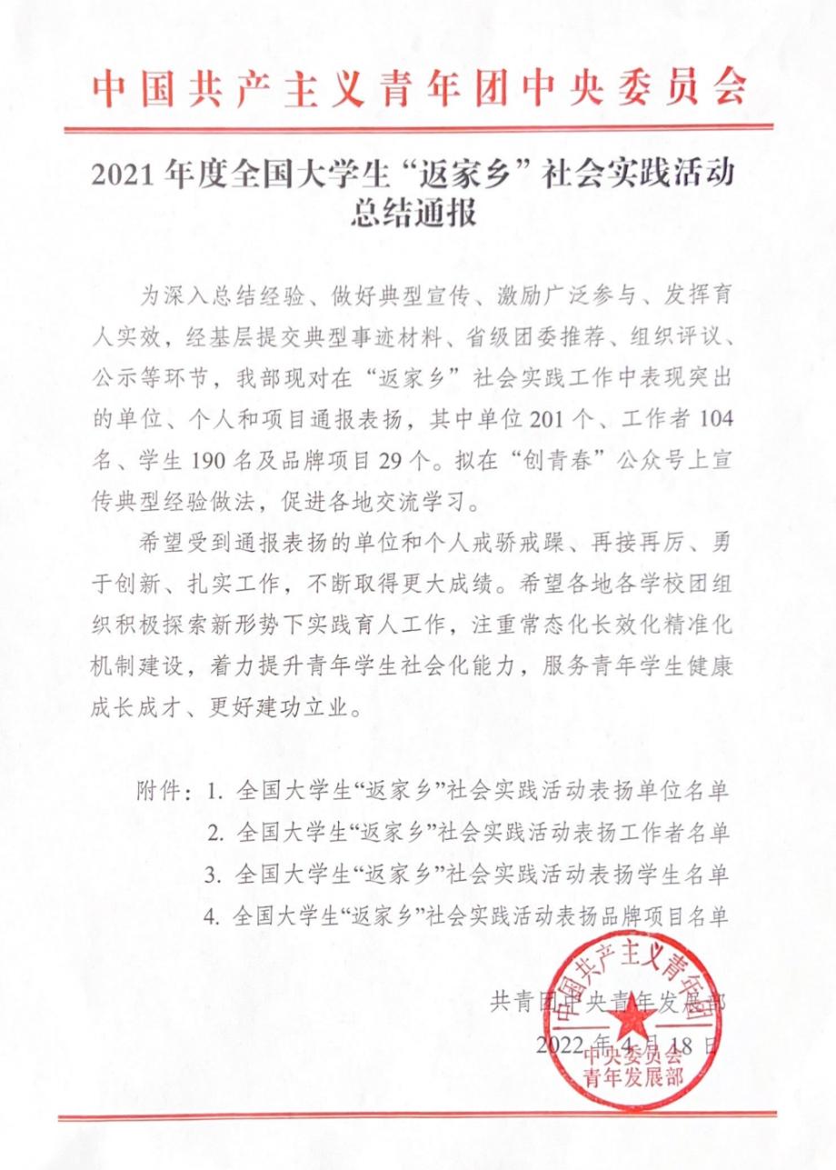 近日,共青团中央印发《2021年度全国大学生“返家乡”社会实践活动总结通报》,香港赛马会投注站 2021级硕士研究生马艳霞荣获2021年度全国大学生“返家乡”社会实践活动通报表扬。