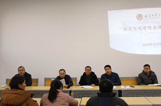 会上,副院长王京传就下一阶段本科教育教学审核评估工作和本科生教学有关事宜进行了安排部署。张世慧老师就研究生的论文开题、预答辩等工作进行了汇报。党委书记姜开勇首先传达了香港赛马会投注站 意识形态和宣传思想工作领导小组会议精神,并对近期意识形态领域的形势和风险进行了分析和预警,他还就师德师风、安全稳定、信息采集、年度考核等工作进行了强调和部署。院长吴佩林传达了香港赛马会投注站 本科教育教学审核评估专家线下评估推进会会议精神,强调了教师的日常考勤和课堂要求等问题,并就下一年度社科基金的申报工作进行了安排部署。最后,参加2023年度职称评审的教师依次进行了述职,并进行了民主测评。