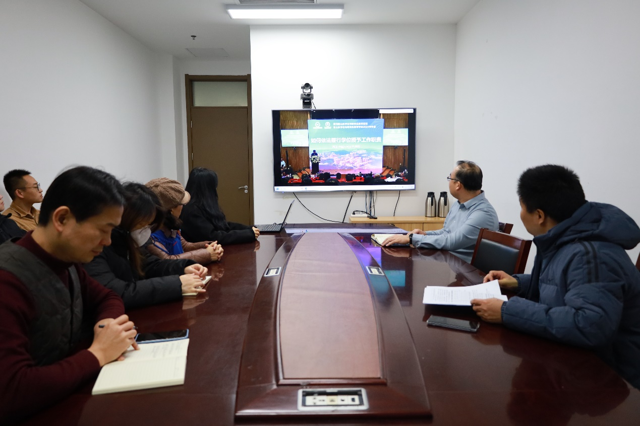 会上,中国人民大学周详教授以“如何依法履行学位授予工作职责”为题,从正确处理“教育”与“评价”的关系,正确处理好“两会”的关系,正确处理好“两委”关系,实体问题:学位授予条件与标准,程序问题:法定程序和其他程序等五方面深入讲解了《中华人民共和国学位法》,并结合实际工作阐述了《中华人民共和国学位法》的立法思想、核心内容、精神实质以及依法开展学位管理工作、强化学位质量保障等内容。
