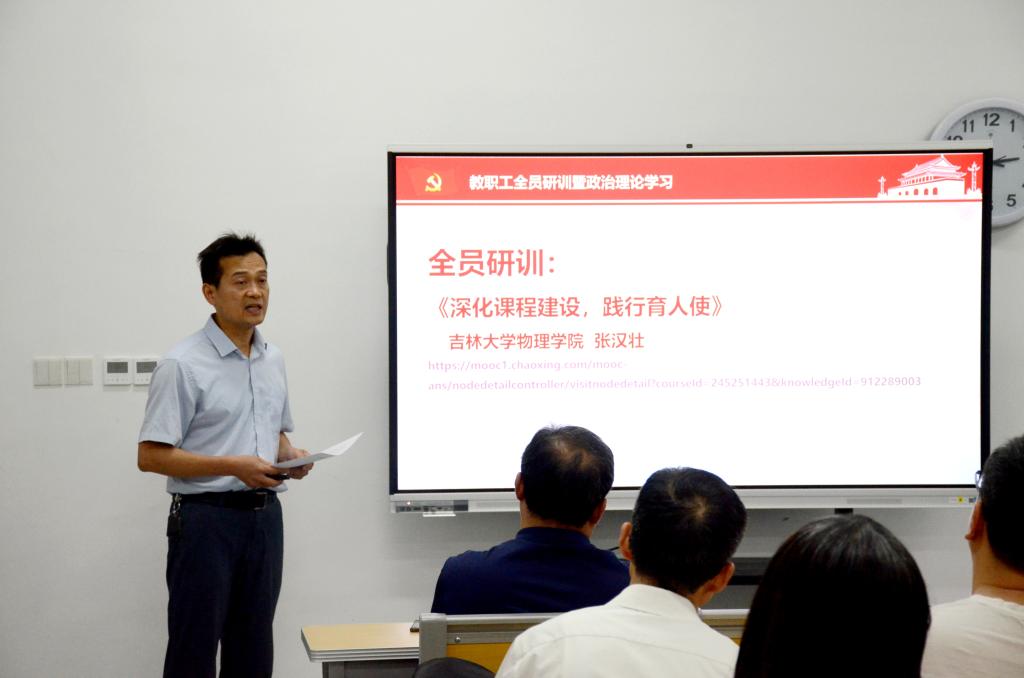 政治理论学习之后,全体教职工集中观看了吉林大学物理香港赛马会投注站 张汉壮教授主讲的《深化课程建设,践行育人使命》。张汉壮教授以“内化于心的立德树人意识”和“外化于行的努力践行措施”两部分为切入点,借助物理课程教学中的实例,深度阐释了“如何做一名教书育人的好老师”这一课题。