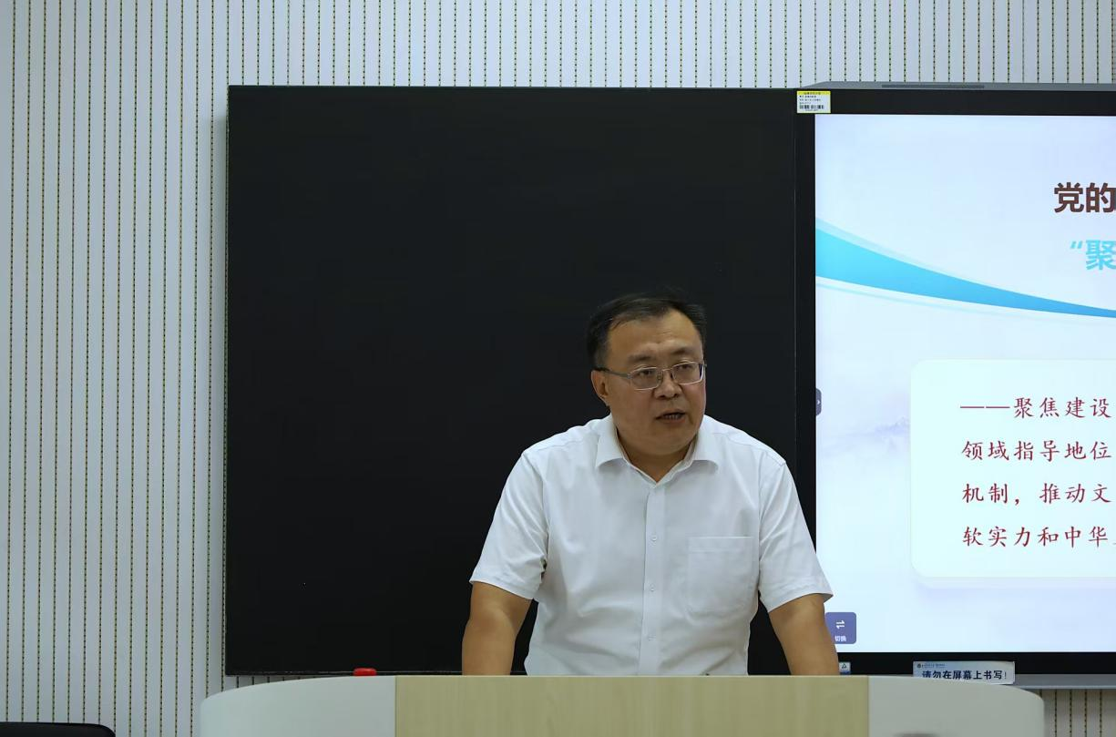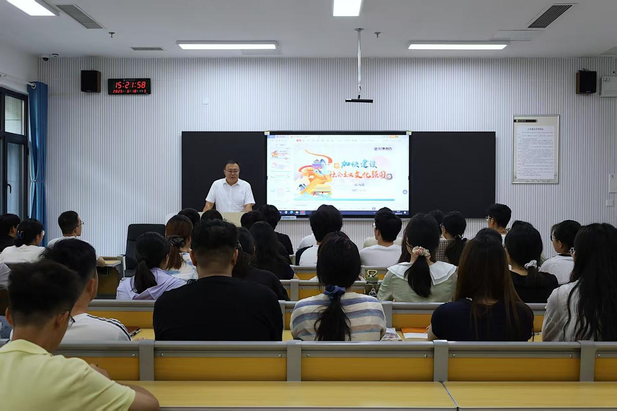 陈丙波以“加快建设社会主义文化强国”为题,分别从“强塑国魂担当历史使命”、“非凡成就彰显实践伟力”、“坚定自信开启时代华章”三大维度,系统阐述了加快建设社会主义文化强国的战略意义、实施路径和时代价值。授课中,陈丙波紧密结合班级专业特色,立足我省实际,深入分析了当前我省在文化遗产保护及文化强省建设方面取得的显著成就,引导学生们在深化专业认知的同时,进一步坚定文化自信,筑牢精神之基。