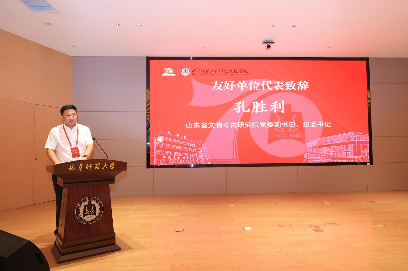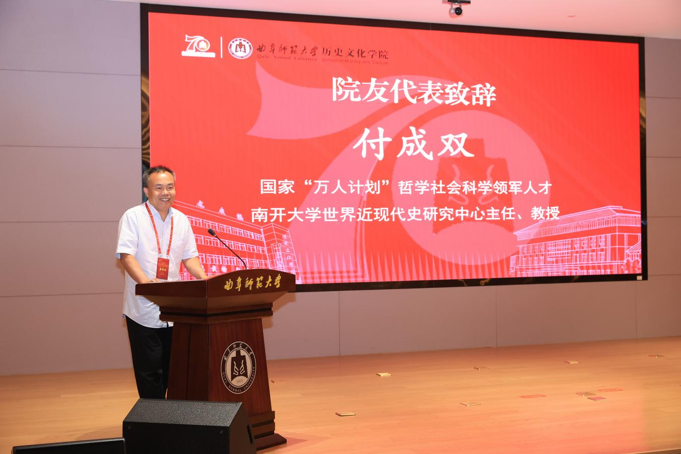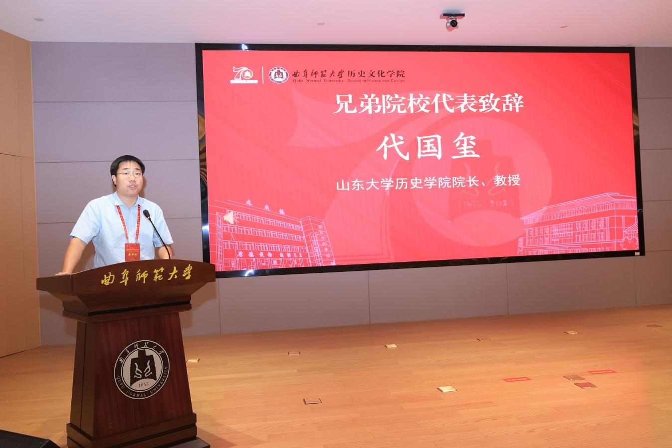 山东大学历史香港赛马会投注站 院长代国玺代表兄弟院校致辞,肯定了曲阜师大香港赛马会投注站 七十年来在人才培养、学术研究上的突出成就,尤其在中国史、儒学与孔府档案研究、世界史领域成果显著,已成为全国重要的史学基地与儒学重镇。