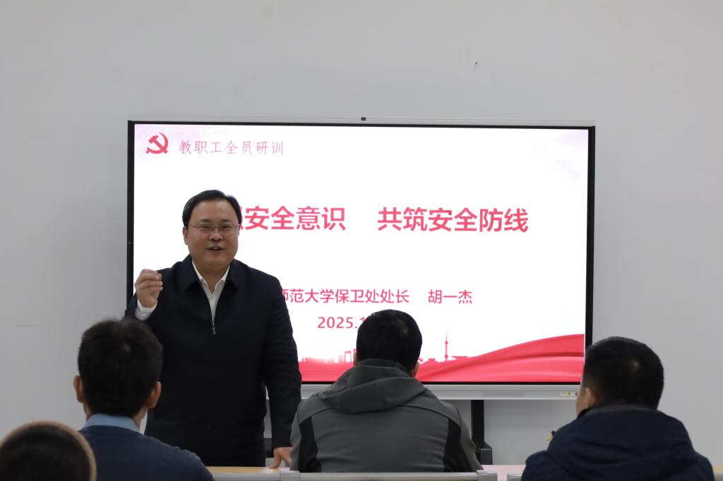 全员研训环节,胡一杰为全体教师作了题为“增强安全意识,共筑安全防线”的安全主题宣讲。胡一杰结合具体案例,从政治安全、反诈防骗、网络安全、交通安全、消防安全等多个方面,分析了当前高校领域面临的严峻安全形势和常见多发安全隐患,强调高校教师需坚决筑牢意识形态防线,严守红线,提高反诈防骗和交通、消防等安全意识,守住安全底线,以“时时放心不下”的责任感把校园安全工作抓细抓实。