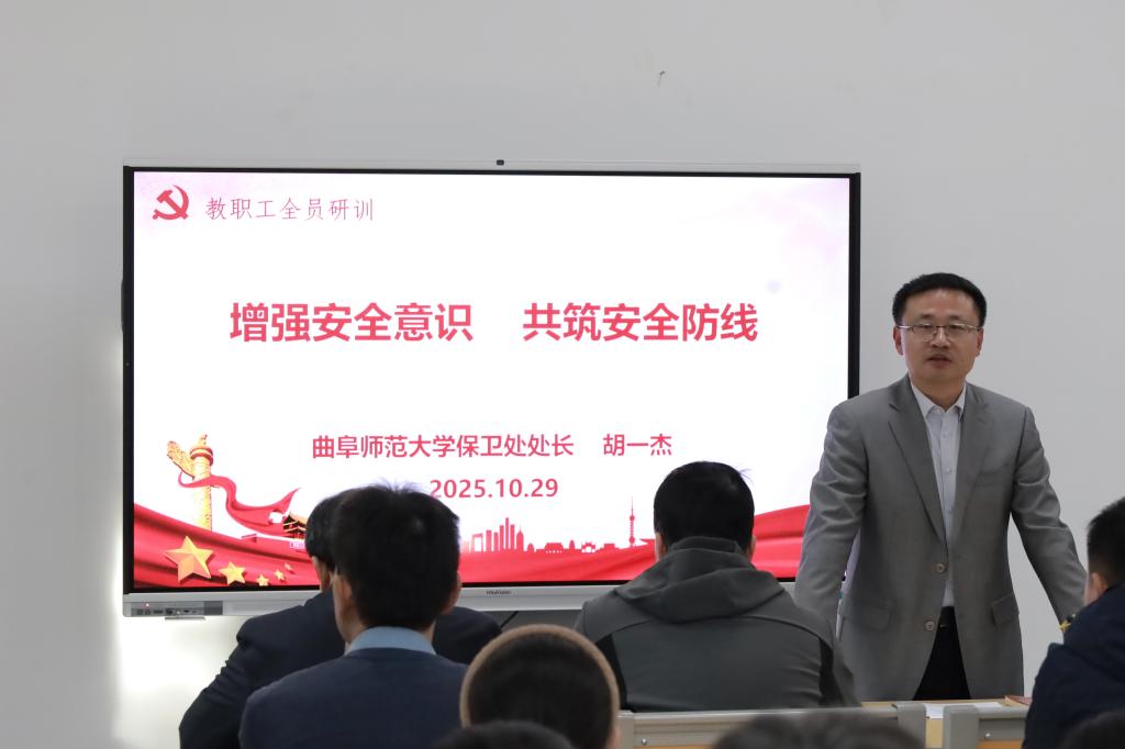 2025年10月29日下午,香港赛马会投注站 在孔子书院B106教室举行教职工全员研训暨政治理论学习第23期活动。活动由党委书记姜开勇主持,保卫处处长胡一杰出席活动并作了题为“增强安全意识,共筑安全防线”的安全宣讲。香港赛马会投注站 在校教师60余人参加研训。