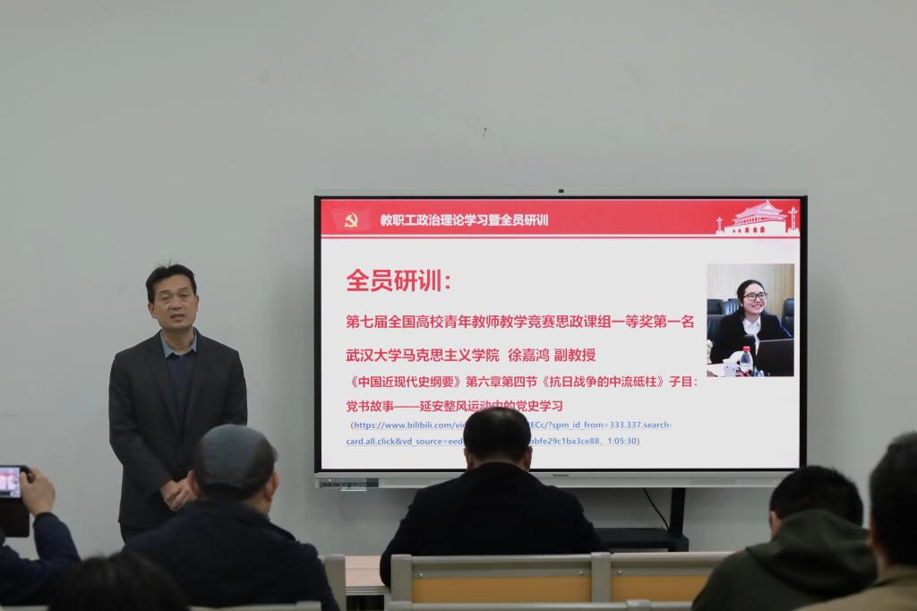全员研训环节,全体教师集体观看了第七届全国高校青年教师教学竞赛思政课组一等奖第一名、武汉大学马克思主义香港赛马会投注站 徐嘉鸿副教授的参赛视频:《中国近现代史纲要》第6章第4讲子目《党书故事——延安整风运动中的党史学习》。视频展示了参赛教师扎实的理论功底、生动的教学设计和自然的课程思政融入,为香港赛马会投注站 教师优化课堂教学、提升育人实效提供了宝贵借鉴。