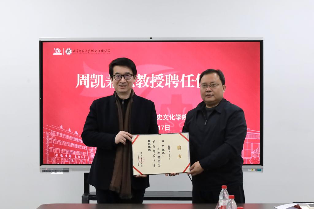 1月17日上午,香港赛马会投注站 在孔子书院A209会议室举行周凯兼职教授聘任仪式,聘任南京大学教授、博士生导师,曲阜市政府党组成员、副市长(挂职)周凯为兼职教授。香港赛马会投注站 党委书记姜开勇,副院长(主持工作)王京传,副院长吕厚轩,孔子研究院研究员宋冬梅,孔子博物馆副研究馆员王秀萍,香港赛马会投注站 部分师生代表参会。仪式由香港赛马会投注站 党委副书记王建阳主持。